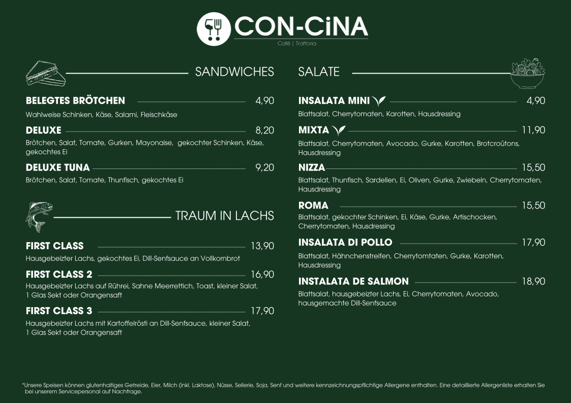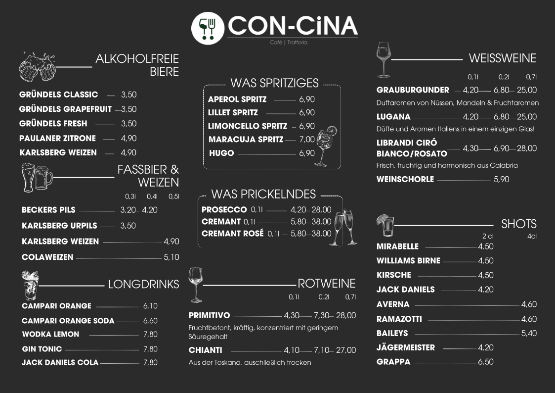 The menu at CON-CiNA features a selection suitable for breakfast and casual dining throughout the day. It primarily offers a variety of food and drink options typical for a café and restaurant setting in St. Ingbert.
